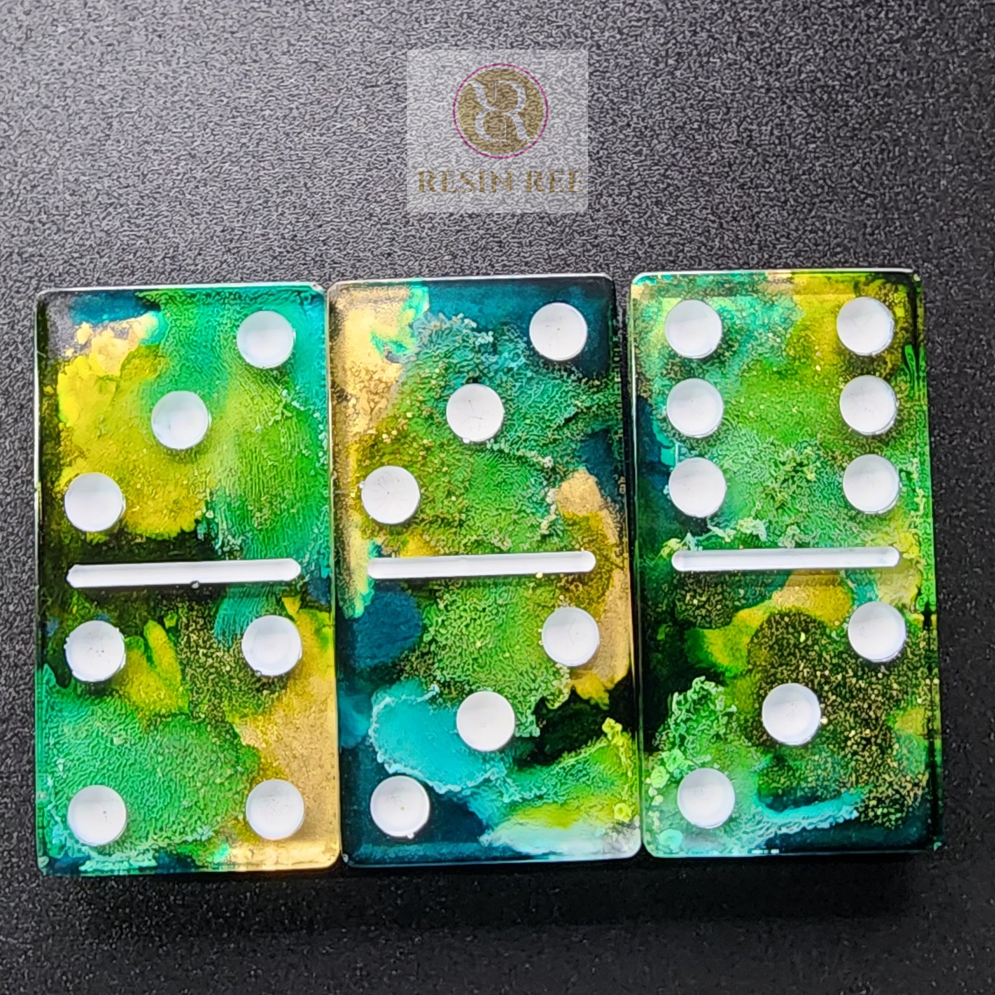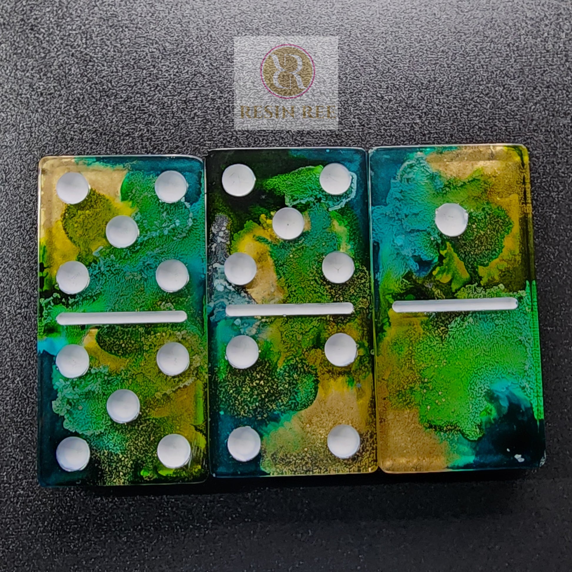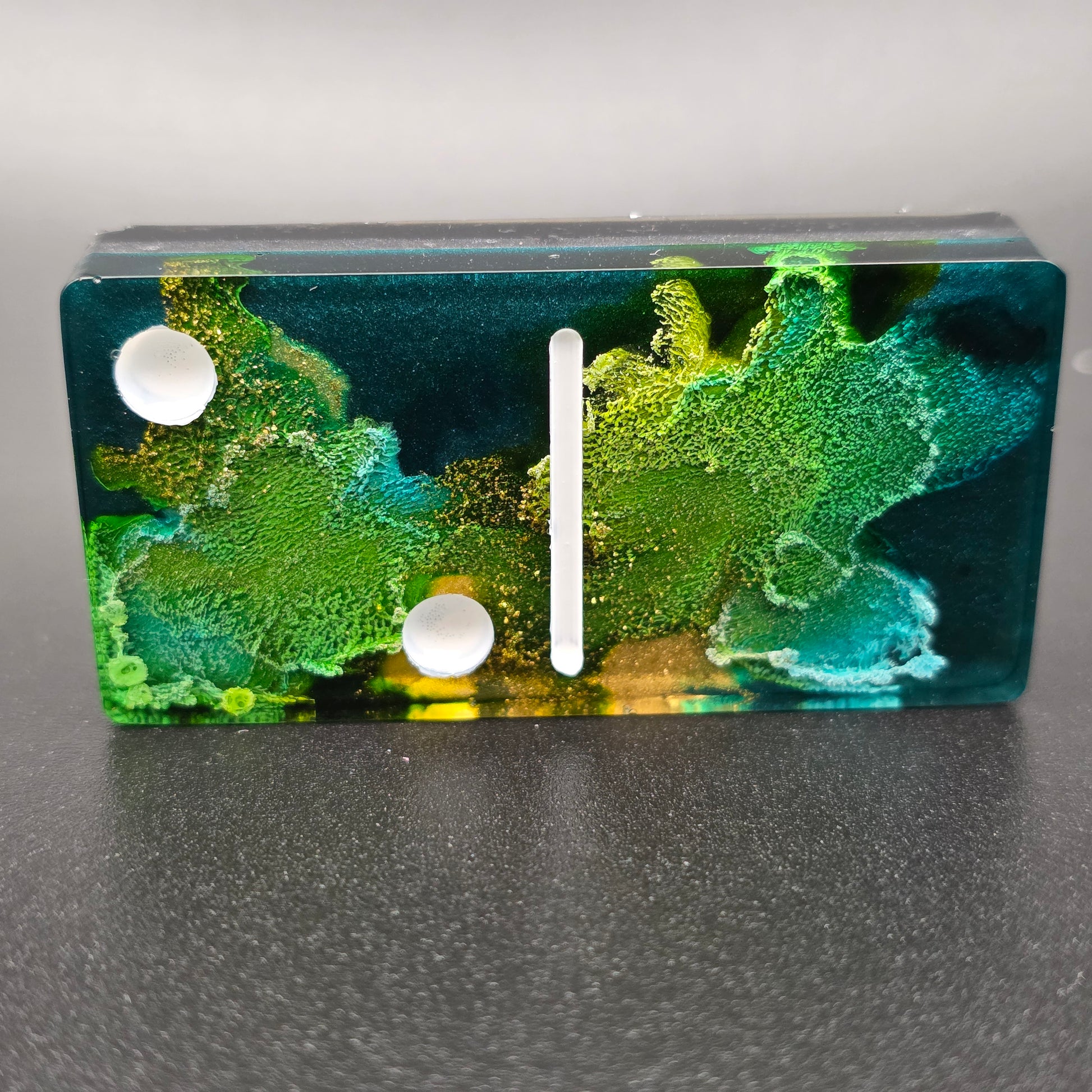 Bold splashes of green, gold, and turquoise collide in this one-of-a-kind domino set, making every game feel like a tropical escape. Hand-poured and full of texture, these pieces are equal parts art and play.