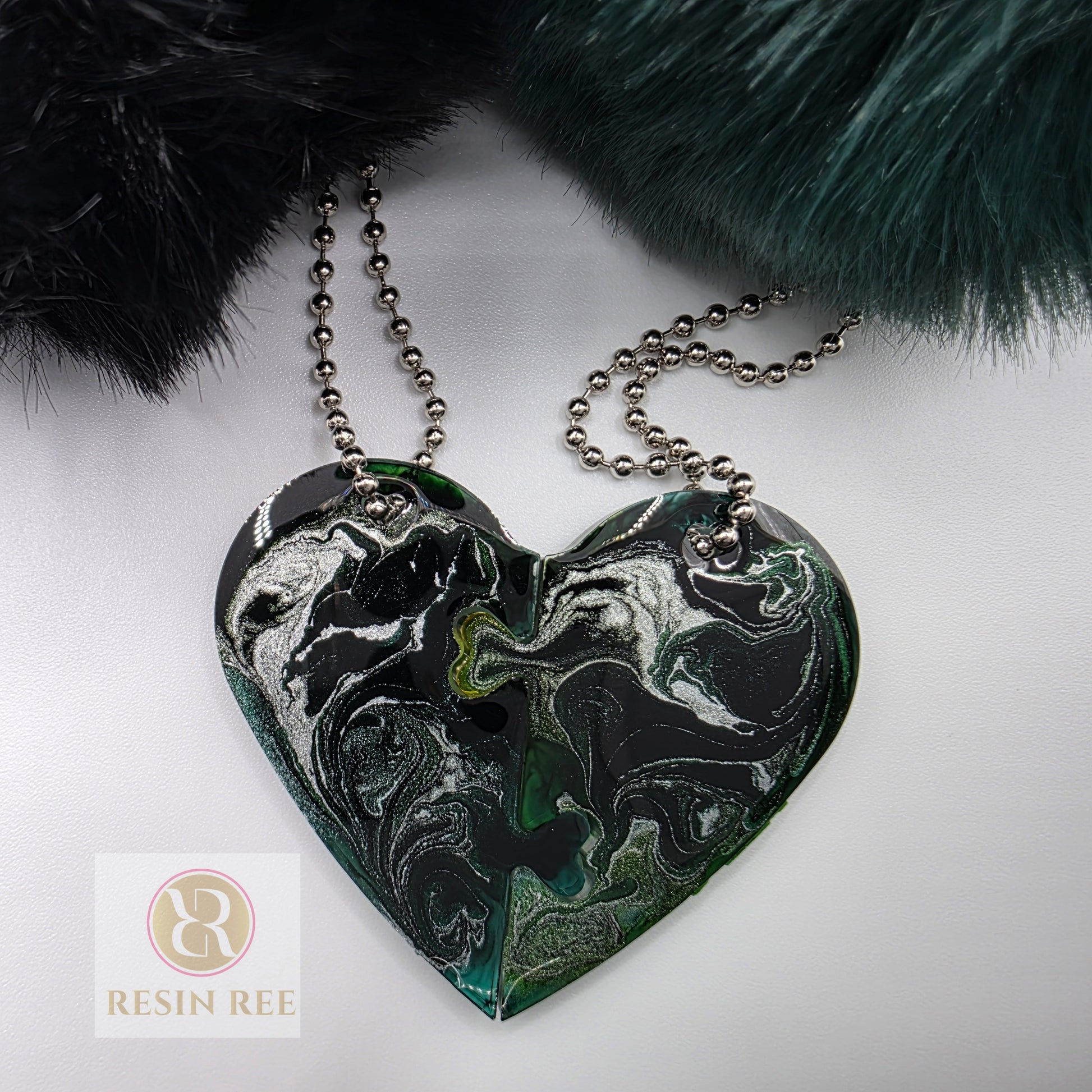 Designed in deep emerald, silver, and black swirling patterns, each side of the heart is fully reversible, giving you two unique looks in one. The glossy finish highlights every swirl, shimmer, and metallic detail, making this set eye-catching from all angles.