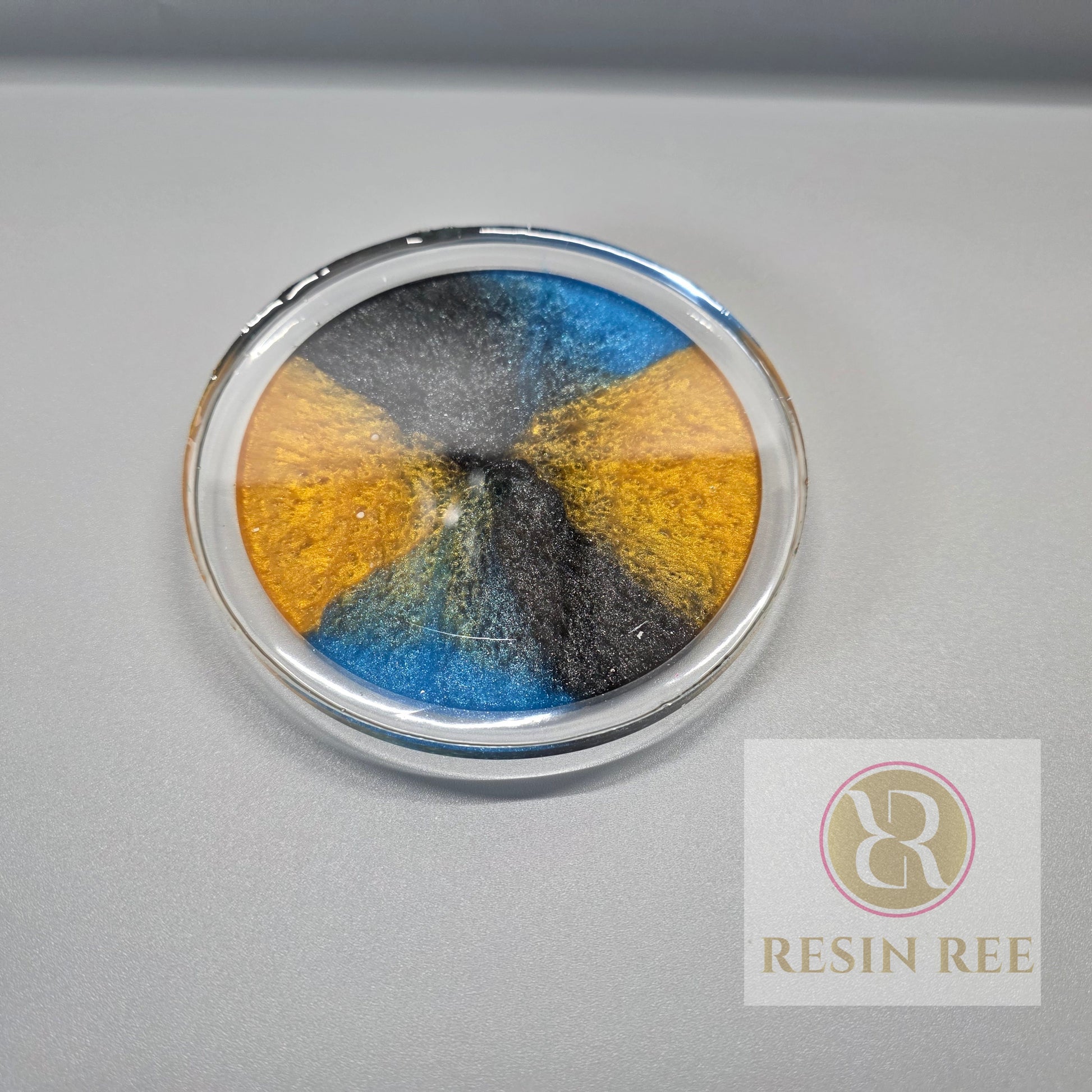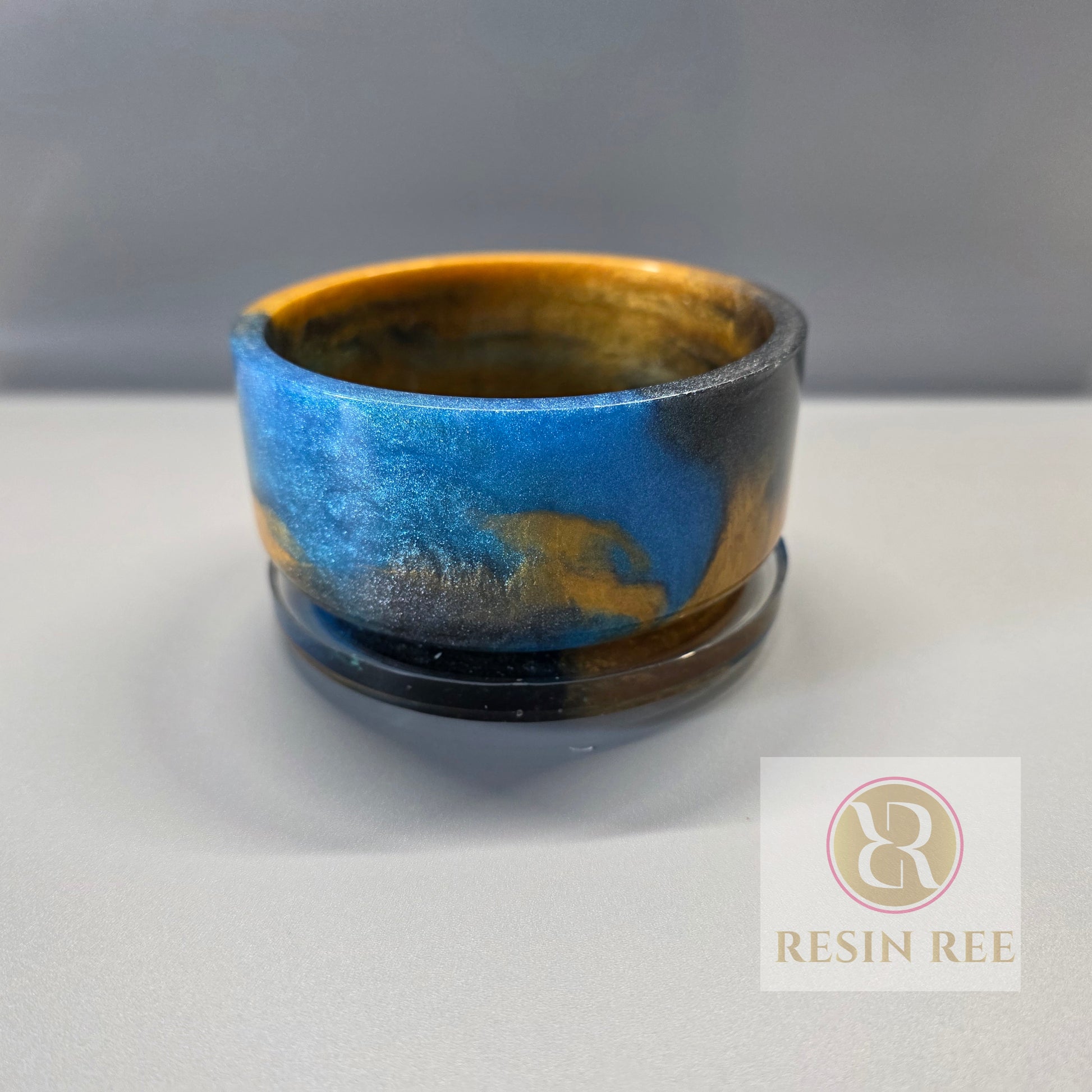 Add a touch of luxury to your plant collection with this one-of-a-kind hand-poured resin potted plant holder. Featuring a rich blend of ocean blue, metallic gold, and charcoal black, each piece shifts beautifully in the light and brings an elegant, modern aesthetic to any space.