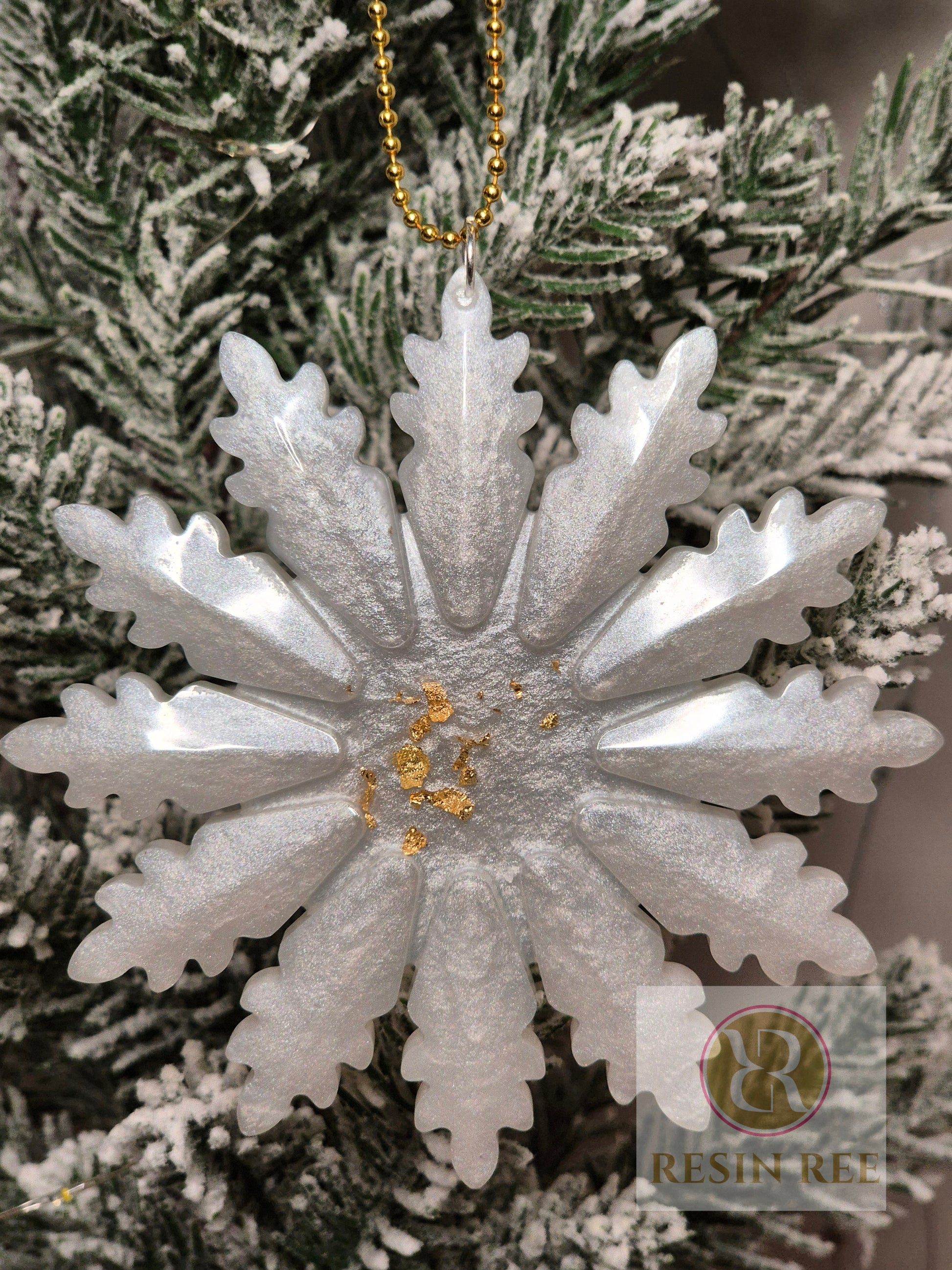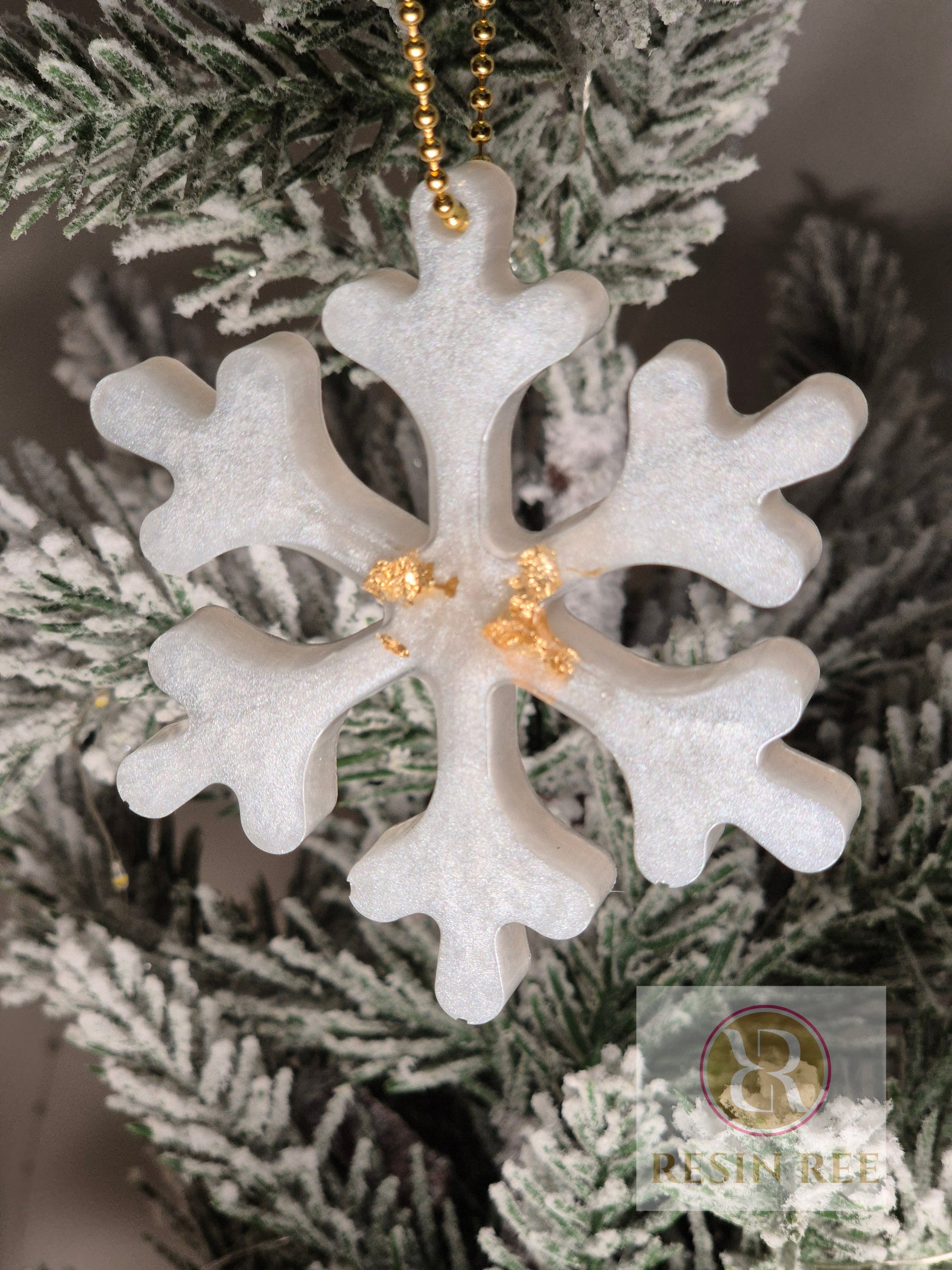 Bring timeless elegance to your holiday décor with this set of three handcrafted resin snowflake ornaments. Each design features a delicate blend of white pearl tones and gold leaf accents, offering a luxurious shimmer that complements any Christmas tree theme.